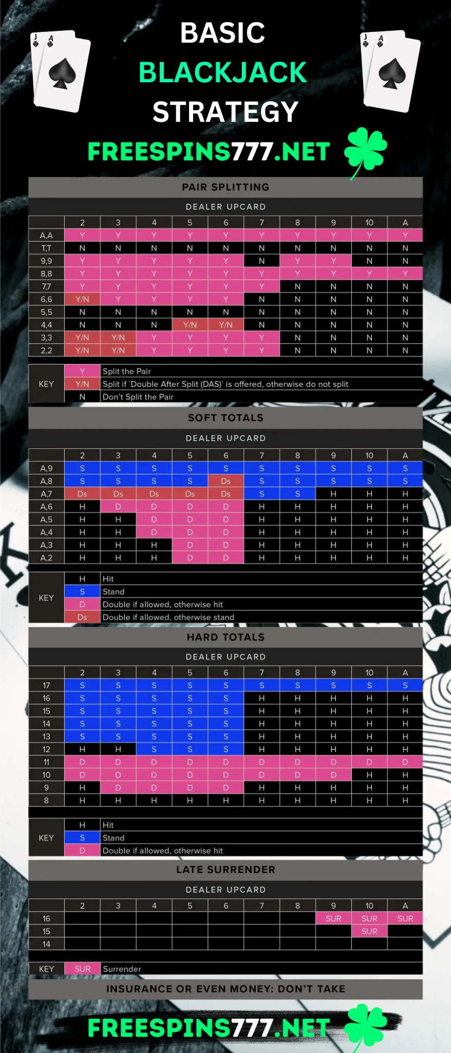 At FreeSpins777.net, we’ve simplified the path to Blackjack success. Download our easy-to-understand Blackjack basic strategy chart directly from our website in PDF or PNG format. Clearly outlined actions—whether to hit, stand, split, double down, or surrender—are provided based on your cards and the dealer’s upcard.